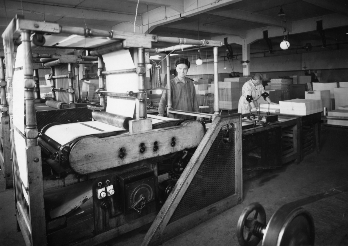 En man och en kvinna arbetar vid en linjeringsmaskin på Papyrus.