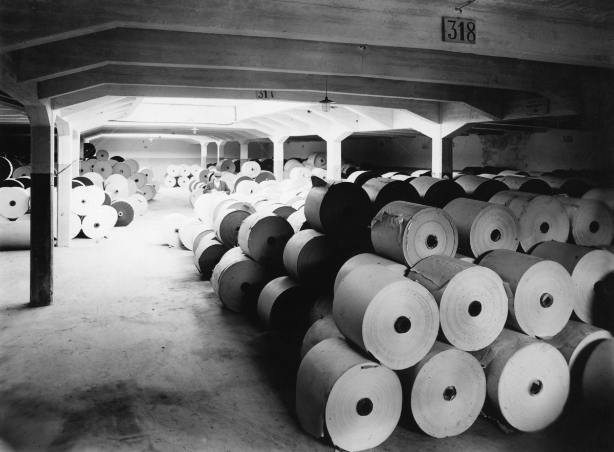 Interiör av ett lager med pappersrullar på Papyrus fabriksområde.