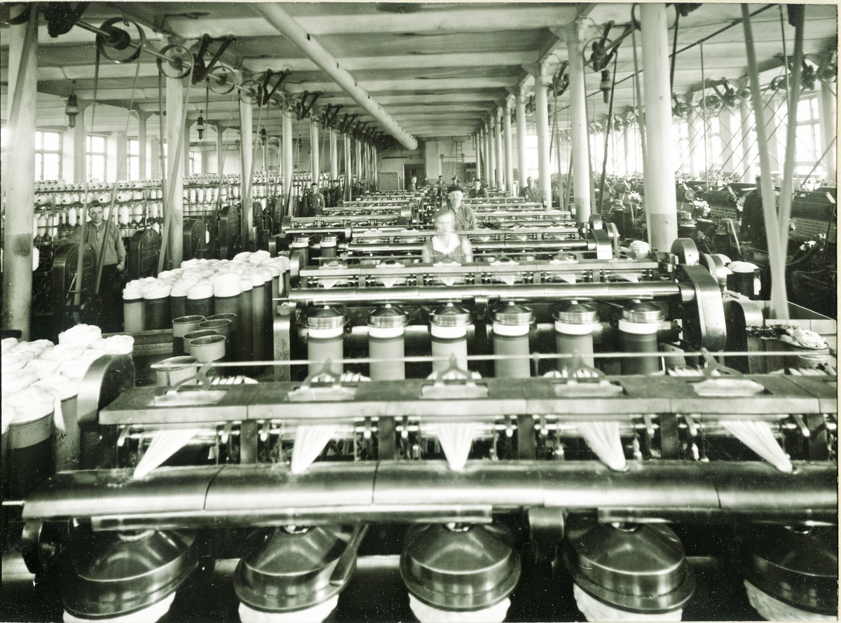 Interiörbild August Werners textilfabrik i Anderstorp i Lindome. 1940-Talet? Några personer på bilden.