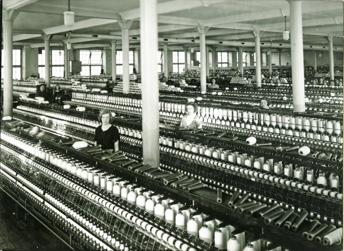 Interiörbild August Werners textilfabrik i Anderstorp i Lindome. 1940-Talet? Några personer på bilden.