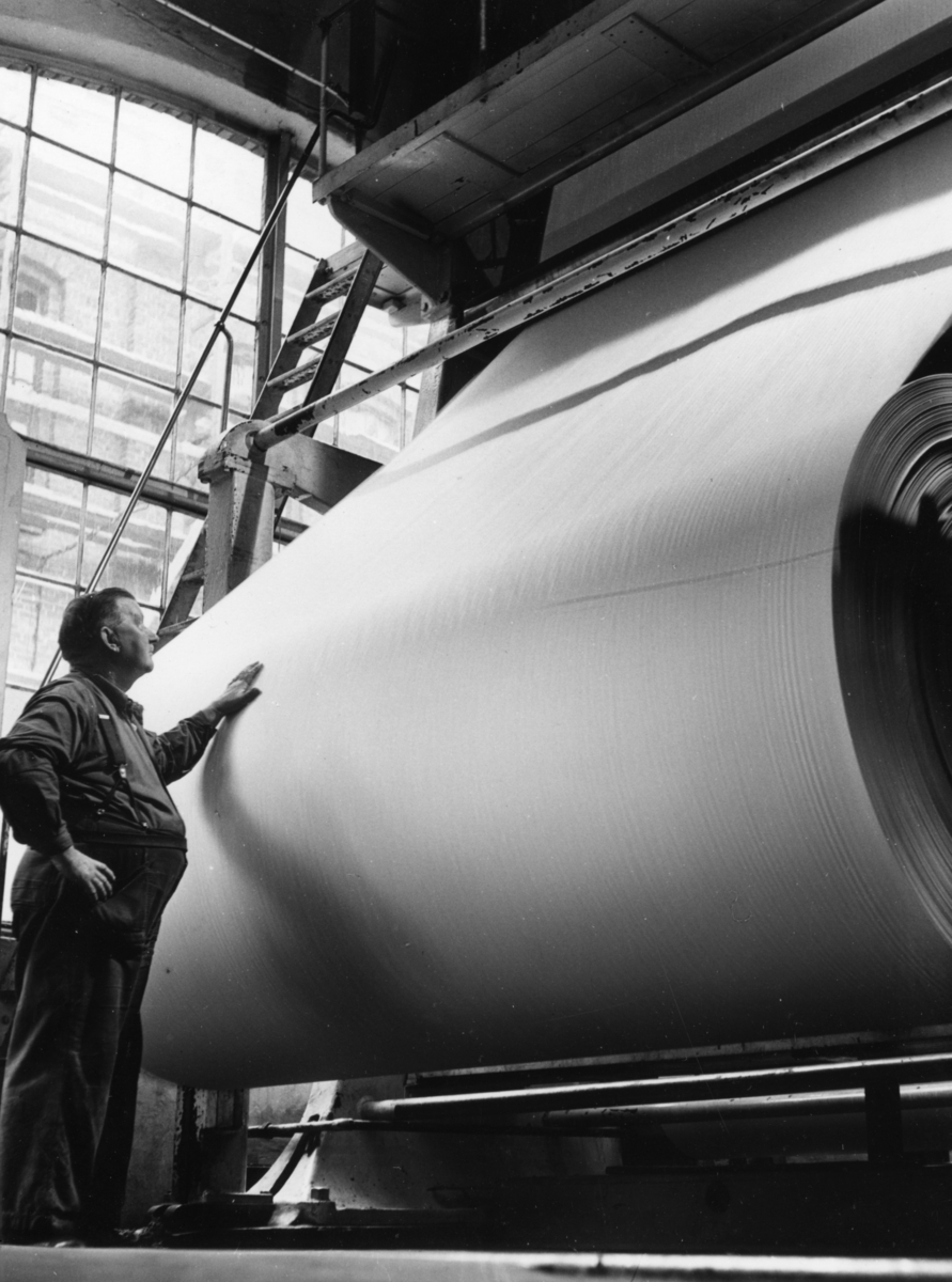 En man arbetar vid maskinen Glätt nr. 3 på Papyrus, okt. 1951.