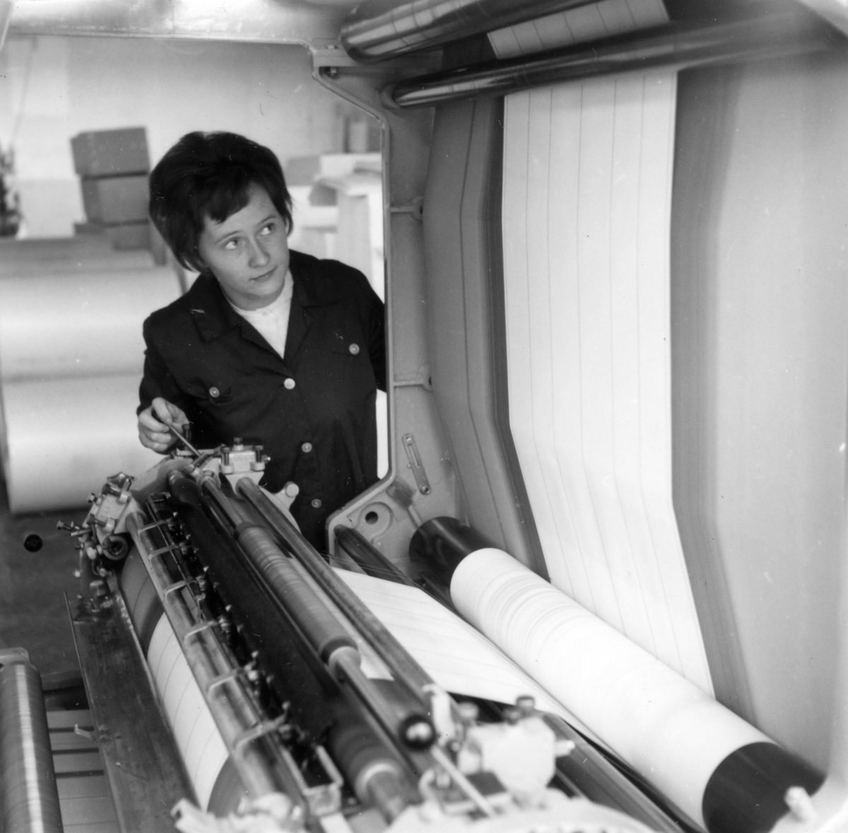 En kvinna arbetar vid linjeringsmaskin nr. 2 på Papyrus, den 15/9-1961.