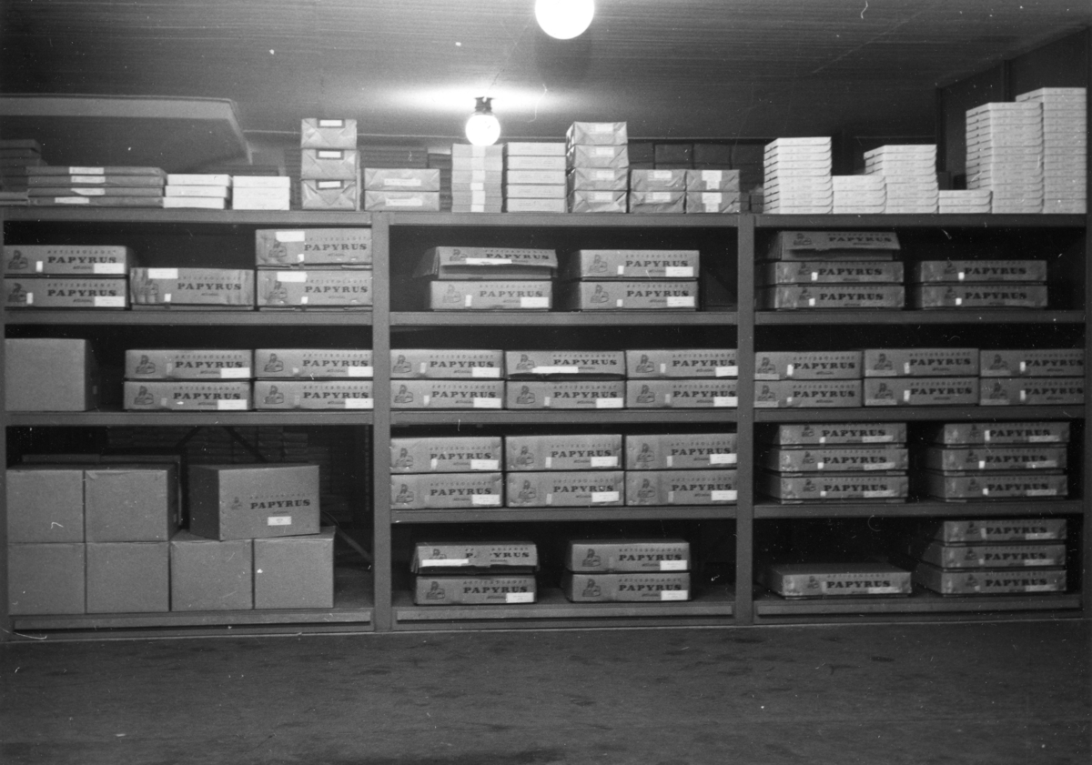Lager med wellpappkartonger på Papyrus, den 15/11-1958.