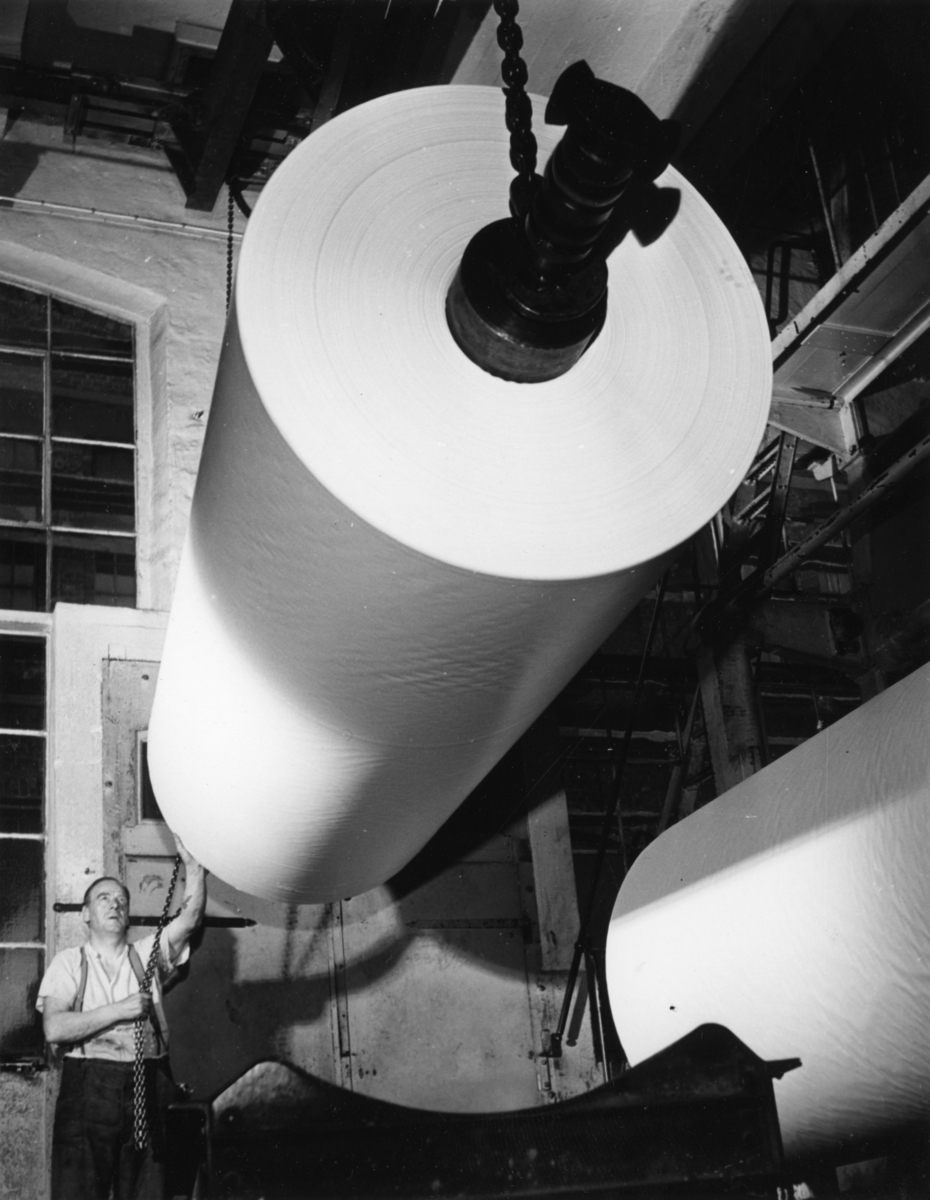 En man arbetar vid maskinen Glätt nr. 3 på Papyrus, okt. 1951. Tambour från XII.