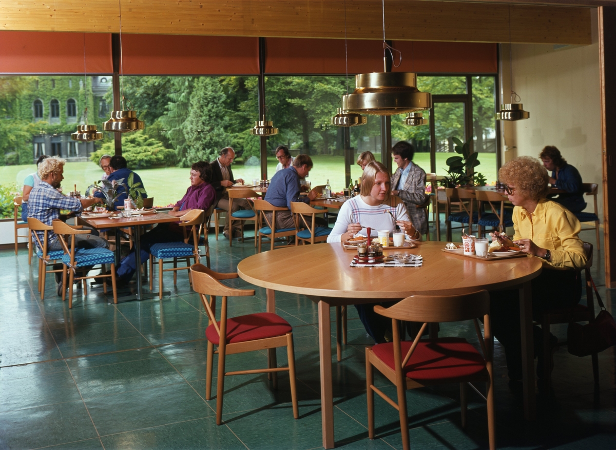 Läängst fram till höger Kristina Dahl. Vid fönstret bord 2 fr.v. Lennart Hallgren, Thomas Simonsson, Inger Anderson, Bjarne Björk.