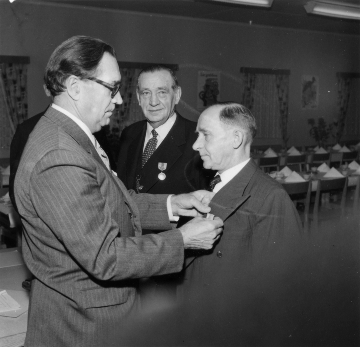 Utdelning av Föreningen för arbetarskydds guldmedalj till Nils Nilsson och Carl Nygren.