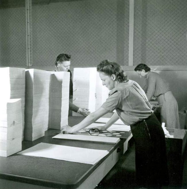 Rivning av brevpapper i Pappeteriet. Två okända kvinnor.