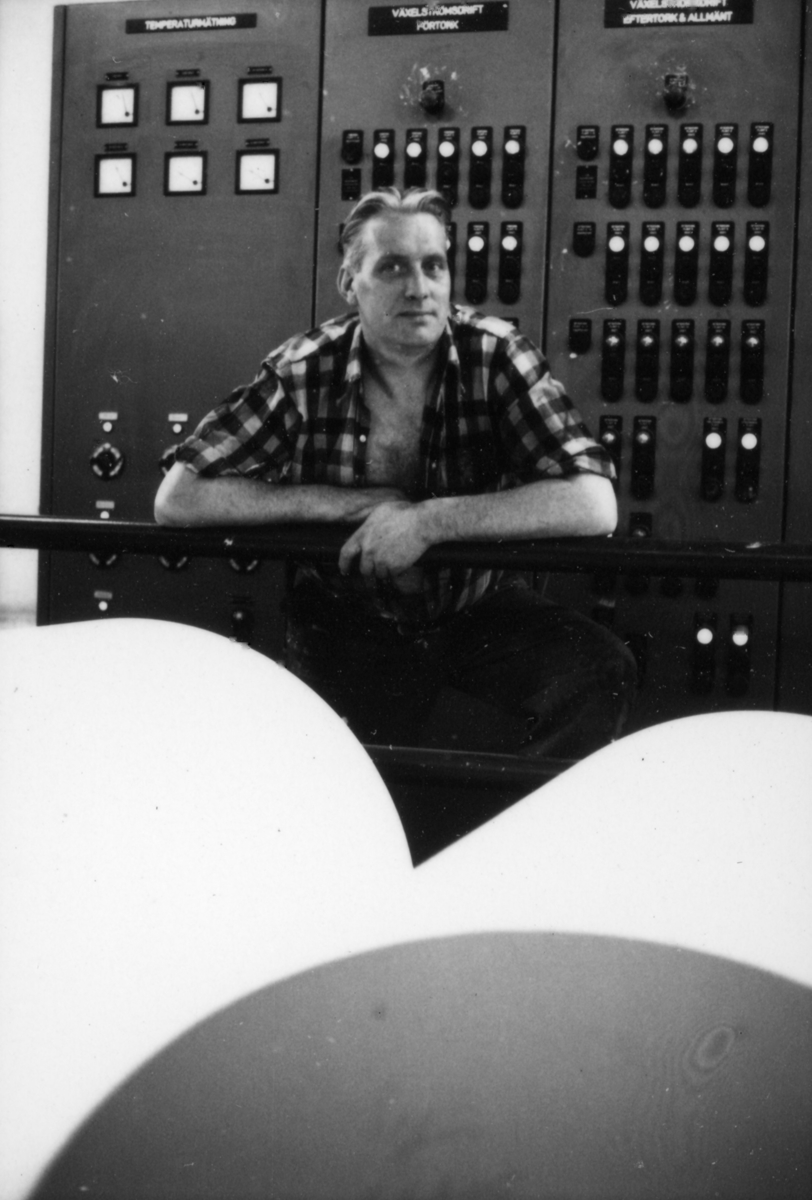 Titel: En man arbetar vid manöverbordet vid målmaskin nr. 1 på Papyrus, 12/5-1970. Fotograf: Rolf Salomonsson, Wezäta studio, Grafiska Vägen Box 5057, 402 22 Göteborg 5 Växel 031/40 01 40