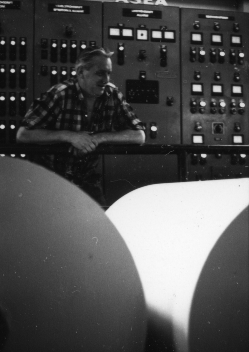 Titel: En man arbetar vid manöverbordet vid målmaskin nr. 1 på Papyrus, 12/5-1970. Fotograf: Rolf Salomonsson, Wezäta studio, Grafiska Vägen Box 5057, 402 22 Göteborg 5 Växel 031/40 01 40