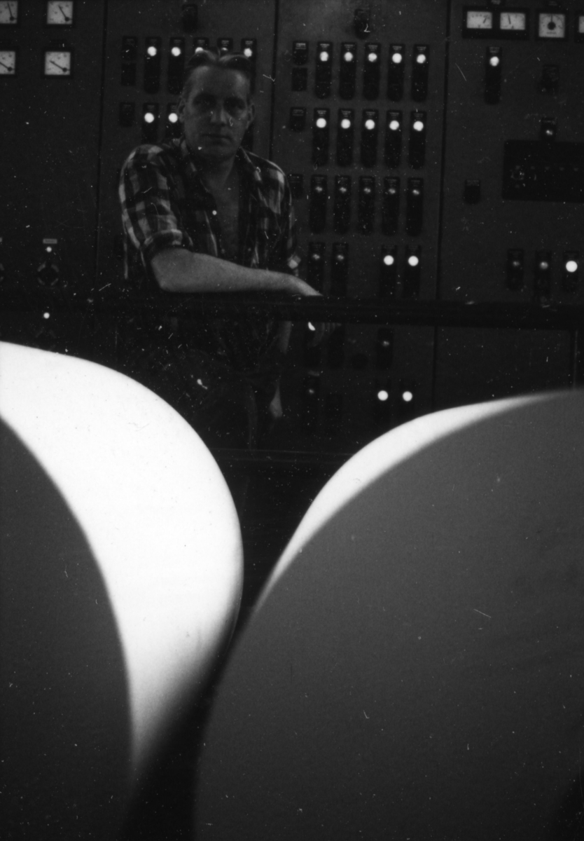 Titel: En man arbetar vid manöverbordet vid målmaskin nr. 1 på Papyrus, 12/5-1970. Fotograf: Rolf Salomonsson, Wezäta studio, Grafiska Vägen Box 5057, 402 22 Göteborg 5 Växel 031/40 01 40