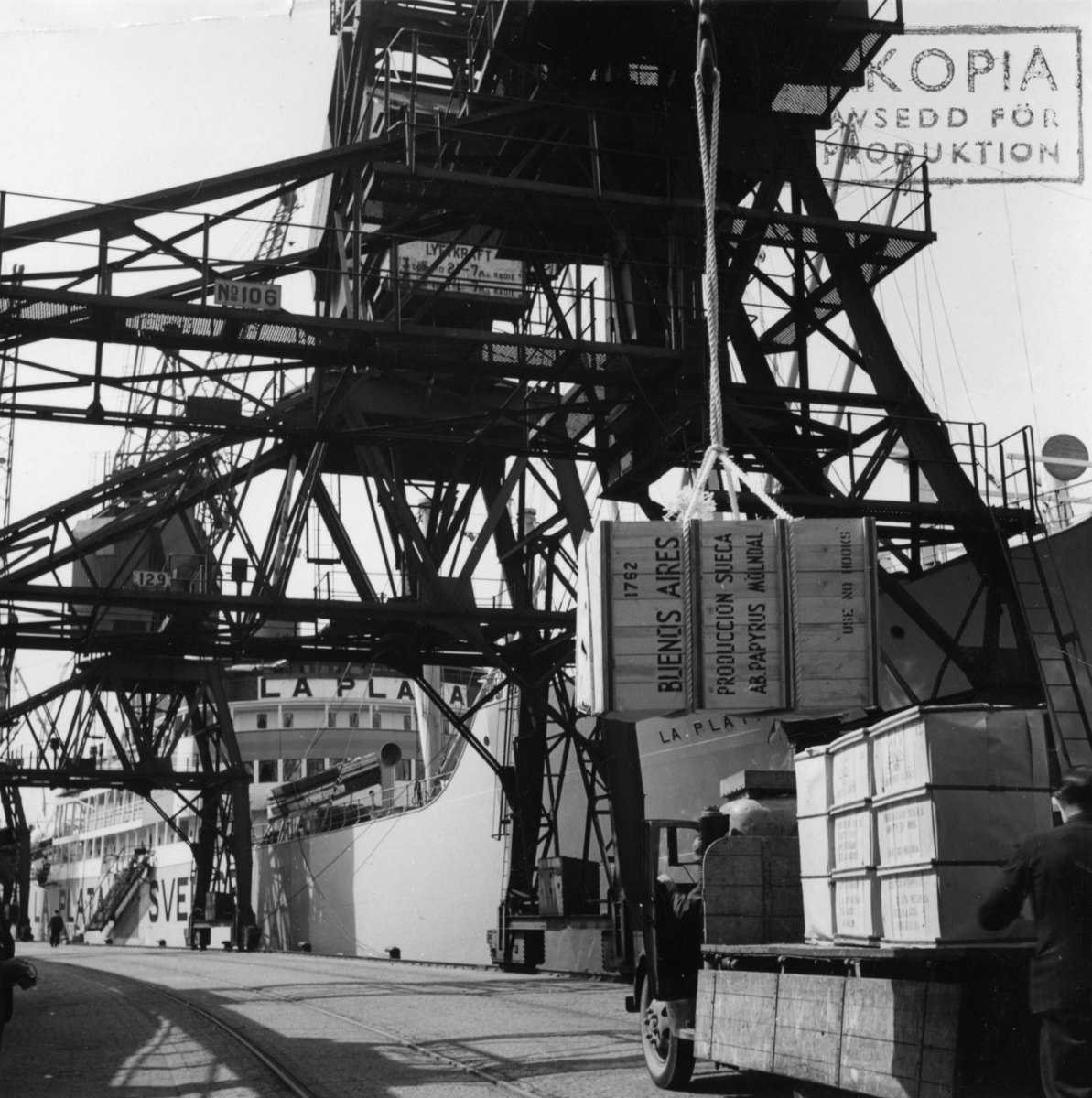 Lastning i hamnen. Fartyget är M/S La Plata som tillhörde Rederi AB Nordstjernan / Johnson Line. Fartygets destination är Buenos Aires i Argentina och i lasten ingick papper tillverkat av AB Papyrus i Mölndal.