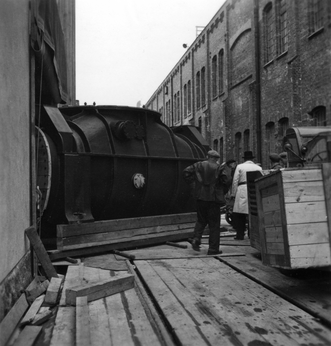 Tre män arbetar med montering av STAL-turbinen på Papyrus, 25/4-1951.