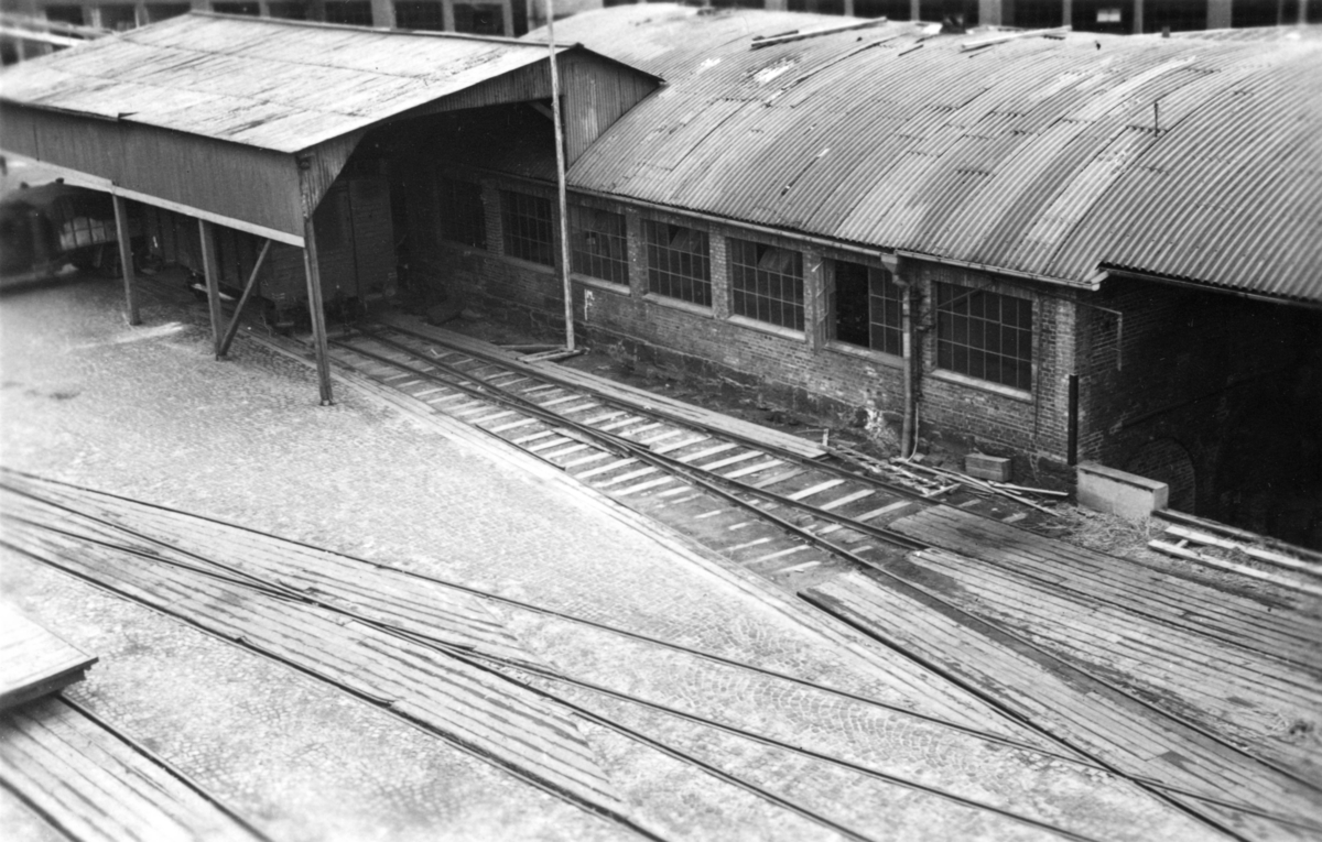 Lagerbyggnad 110 och 111 under uppbyggnad på Papyrus fabriksområde, 25/7-1945.Nedre panncentralen