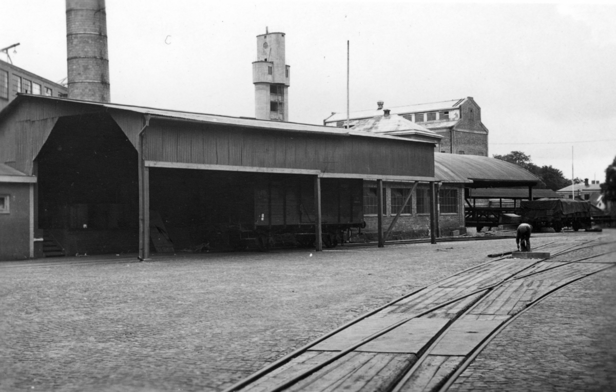 Lagerbyggnad 110 och 111 under uppbyggnad på Papyrus fabriksområde, 25/7-1945. Lastbrygga vid Nedre Ångcentralen.