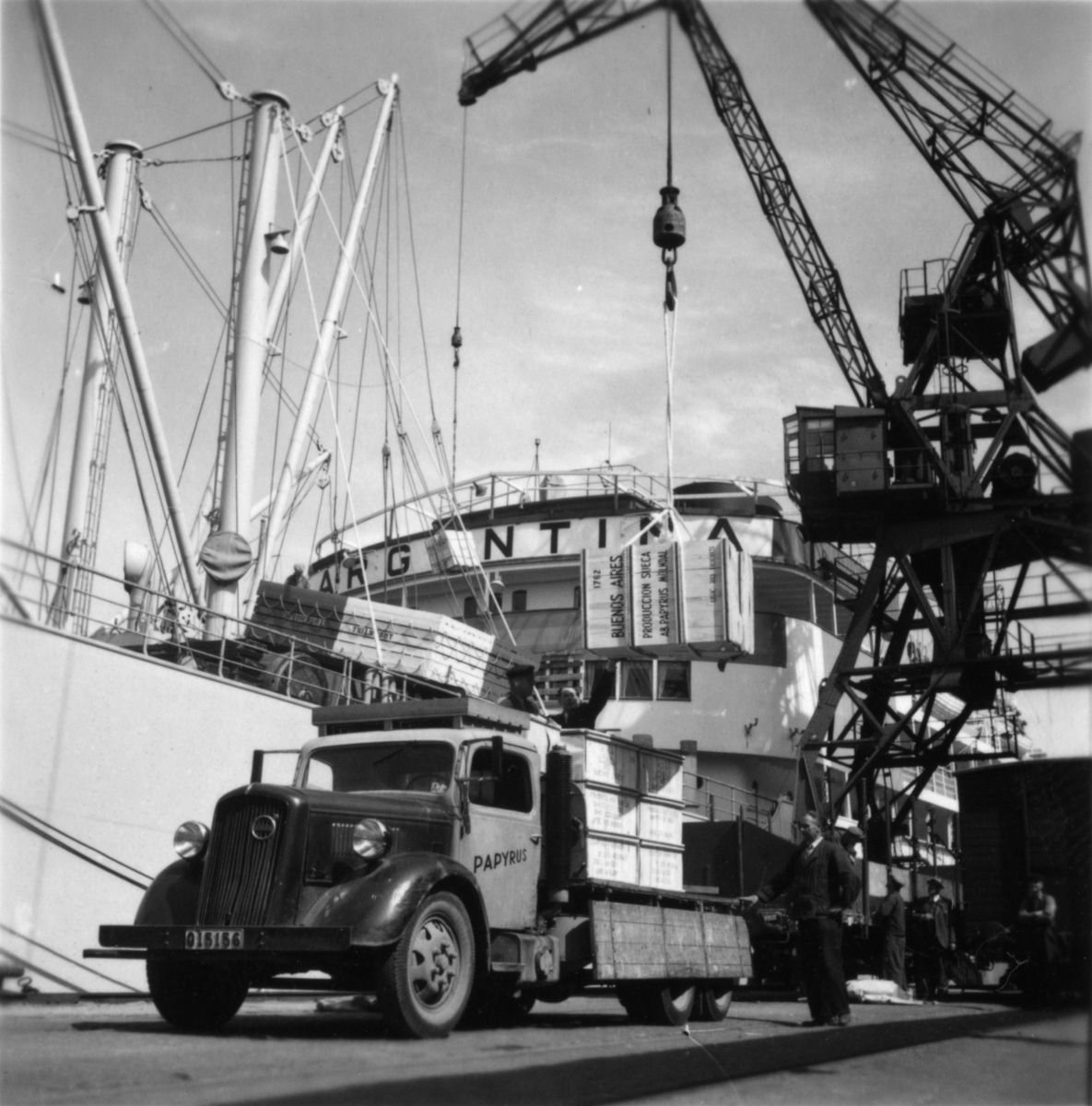 M/S Argentina som tillhörde Rederi AB / Johnson Line ligger för lastning vid Frihamnspiren i Göteborg. Destinationen för resan är Buenos Aires i Argentina, en resa som anträddes 3 april 1942. I lasten ingick bland annat papper från AB Papyrus.