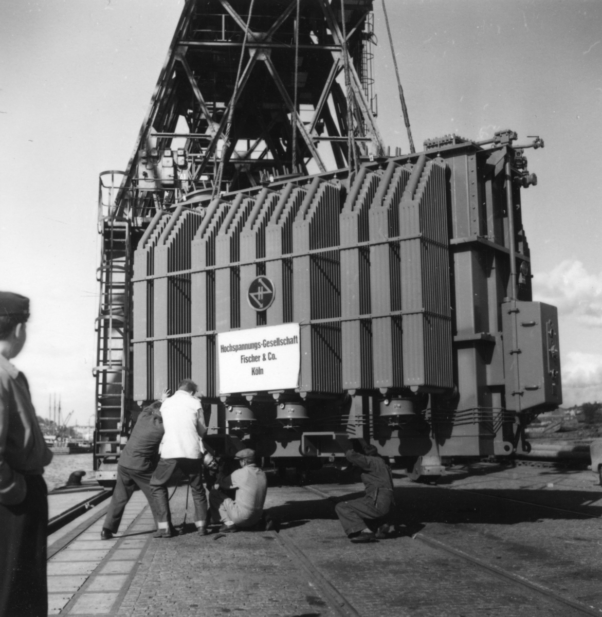 Transport av transformator 50 kW, Omlastning i Göteborgs hamn 17/6-1955. Några män är med på bilden.