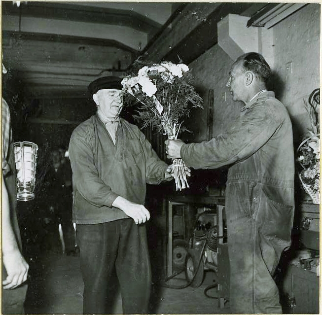 AB Papyrus. Sven "Sme-Sven"Svensson uppmärksammas med blomma från kollega. 30/6 1956. Ytterligare en man figurerar på bilden.