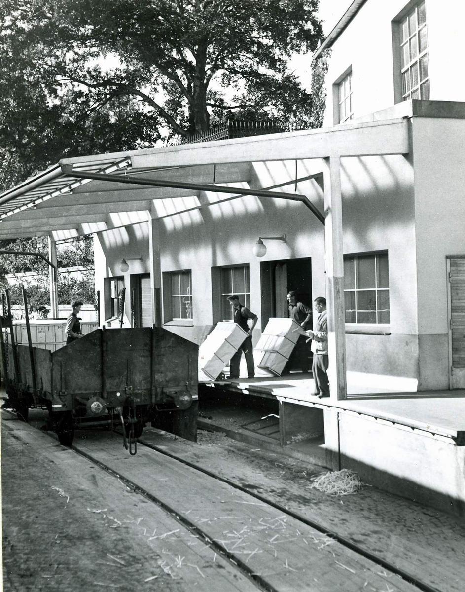 Papyrus, lastning av balar på godsvagn. 4 okända män.