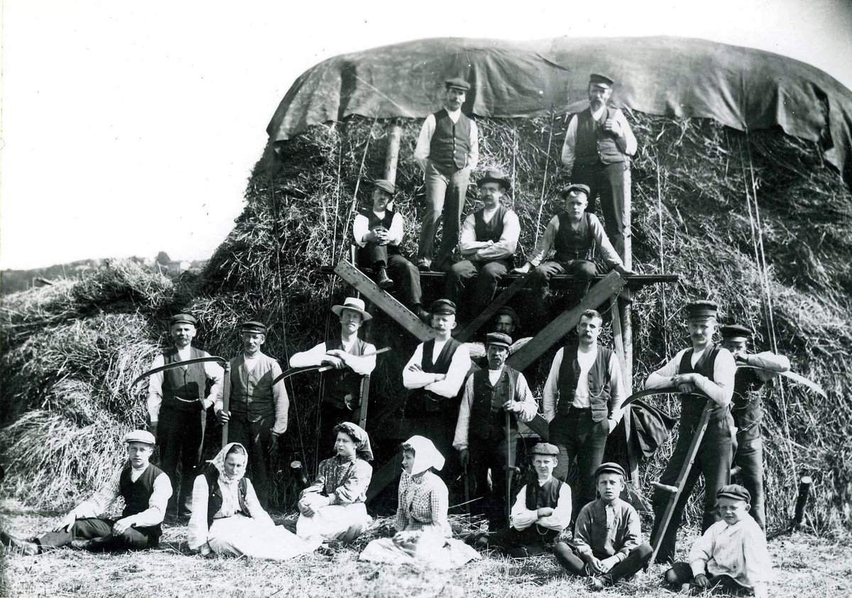 Papyrus personal. På bilden bland annat förman Lindgren och ytearbetare. Bilden tagen under höbärgning år 1909.