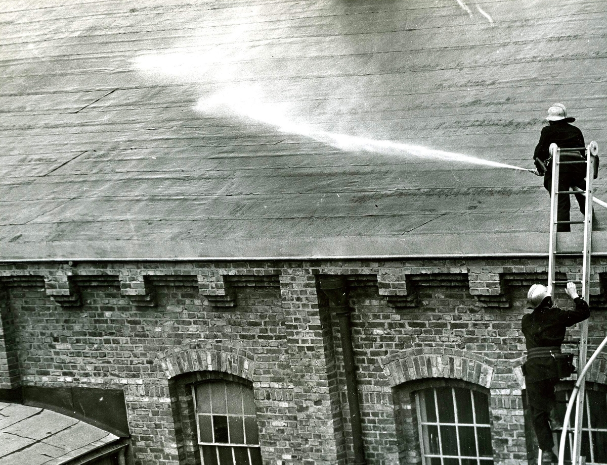 Brandskyddövning på Papyrus. Två okända brandmän.