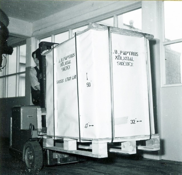 AB Papyrus. Okänd man kör en truck med pall papper avsedd för export. 18/10 1954.