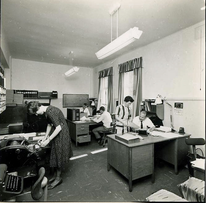 AB Papyrus. Byggnad 11, kontorsinteriörer. 25/5 1964. Fyra okända personer.