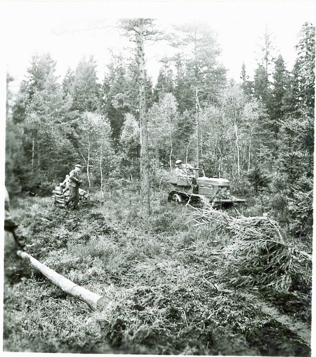 Skogsavverikning. Två pkända män och en bandtraktor. 8/10 1952.
