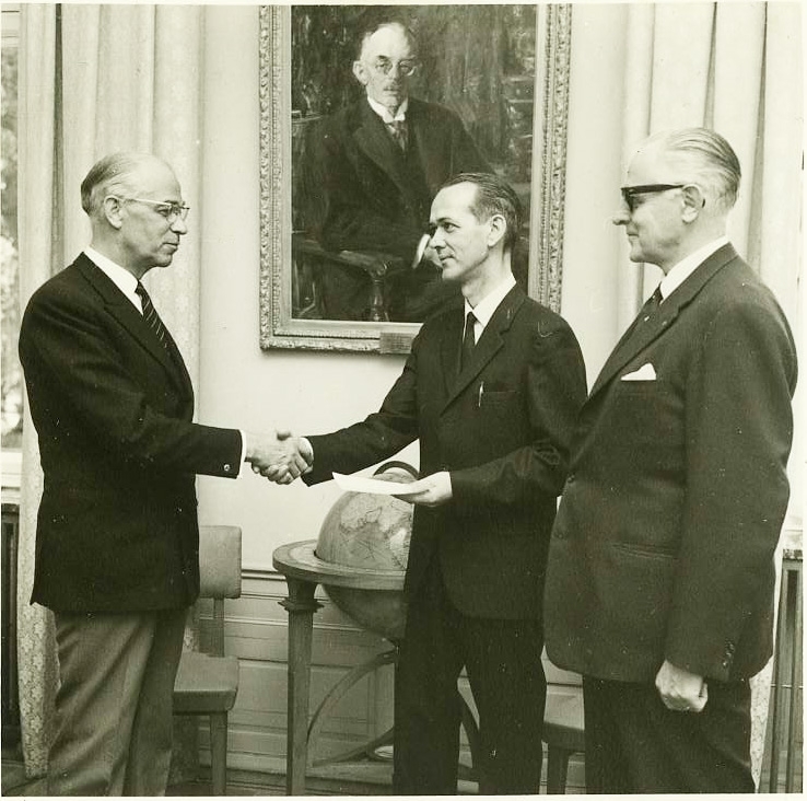 Titel: AB Papyrus. Utdelning av belöning för förslag. Fr. v. Disponent Rudengren, Förman Torsten Larsson och William Tibell.