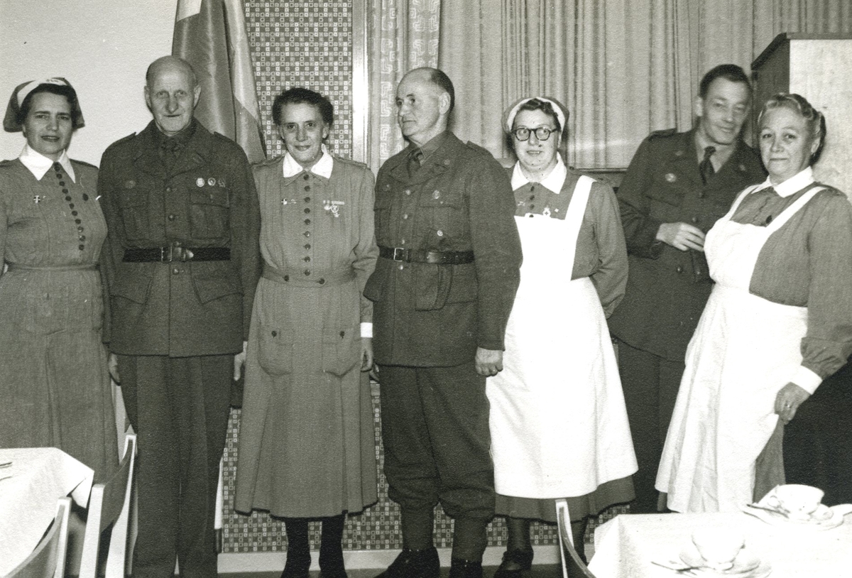 Invigning av Hemvärnsgården i Mölndal år 1953. Fyra okända hemvärnsmän och tre lottor.