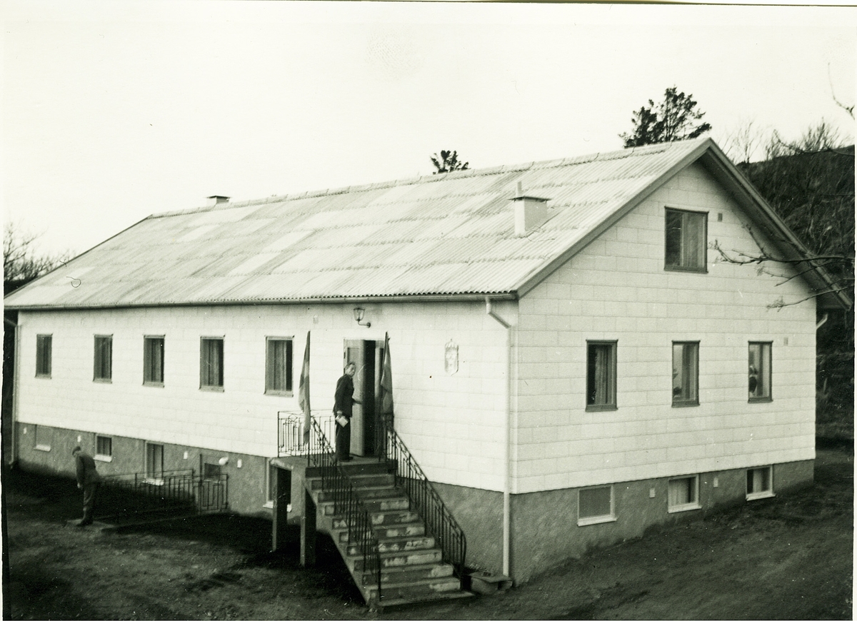 Invigning av Hemvärnsgården i Mölndal år 1953. Hemvärsgården exteriör. Två okända män.