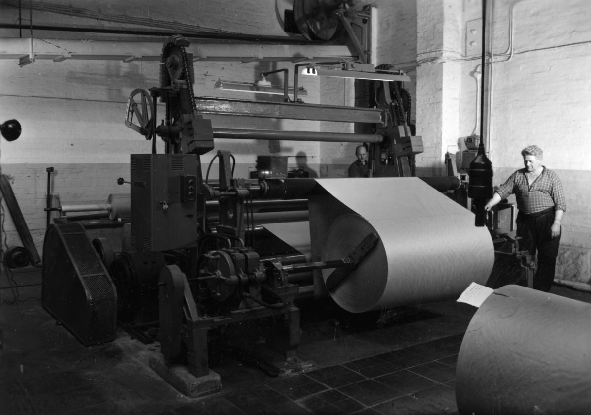 Två män arbetar vid rullmaskin nr. 3 (Cameron) på Papyrus, okt. 1950.