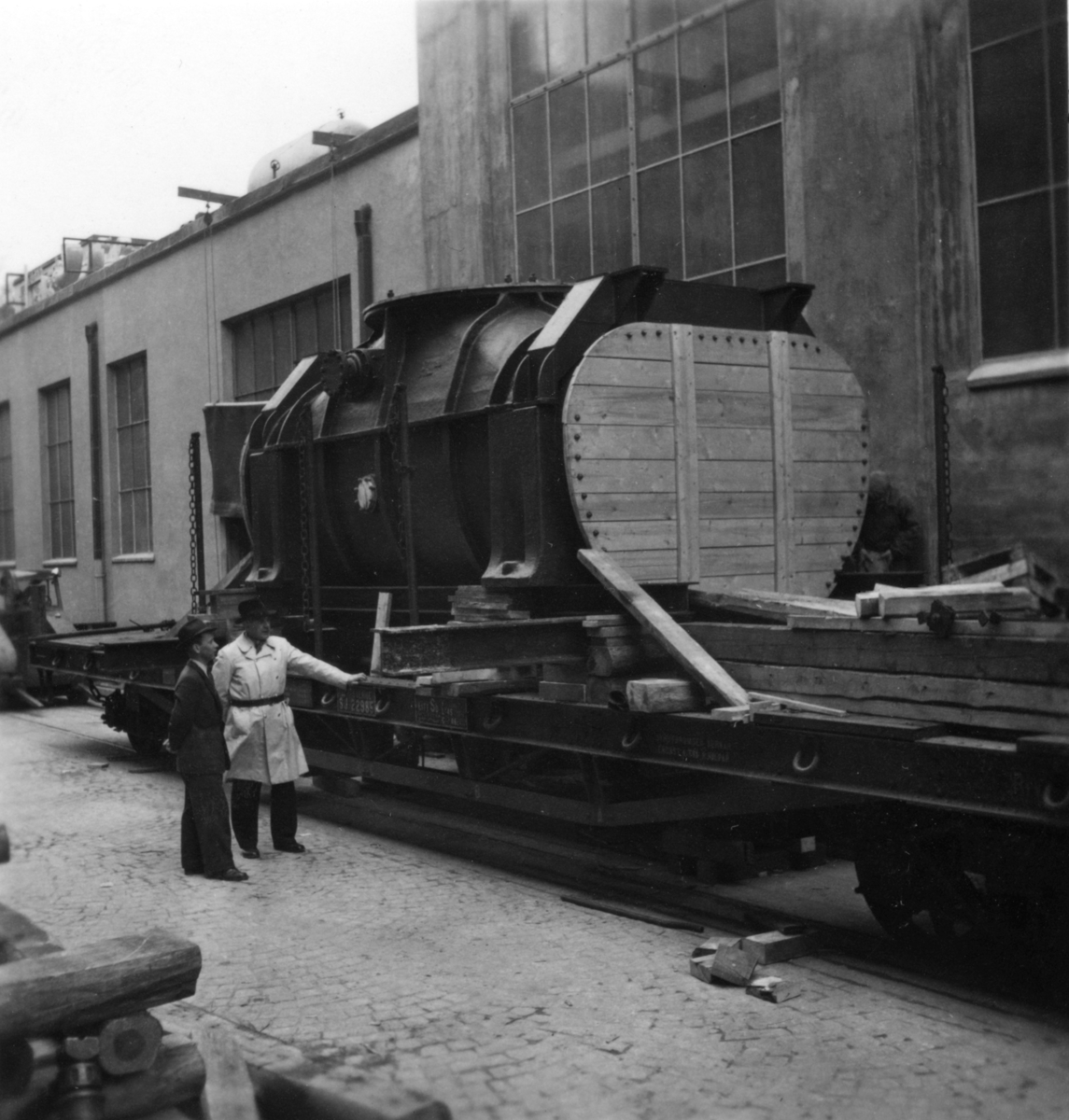 Två män arbetar med montering av STAL-turbinen på Papyrus, 25/4-1951.