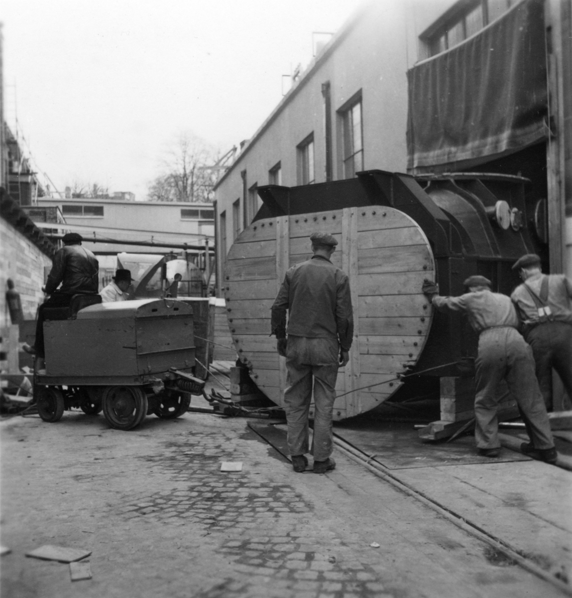 Fem män arbetar med montering av STAL-turbinen på Papyrus, 25/4-1951.