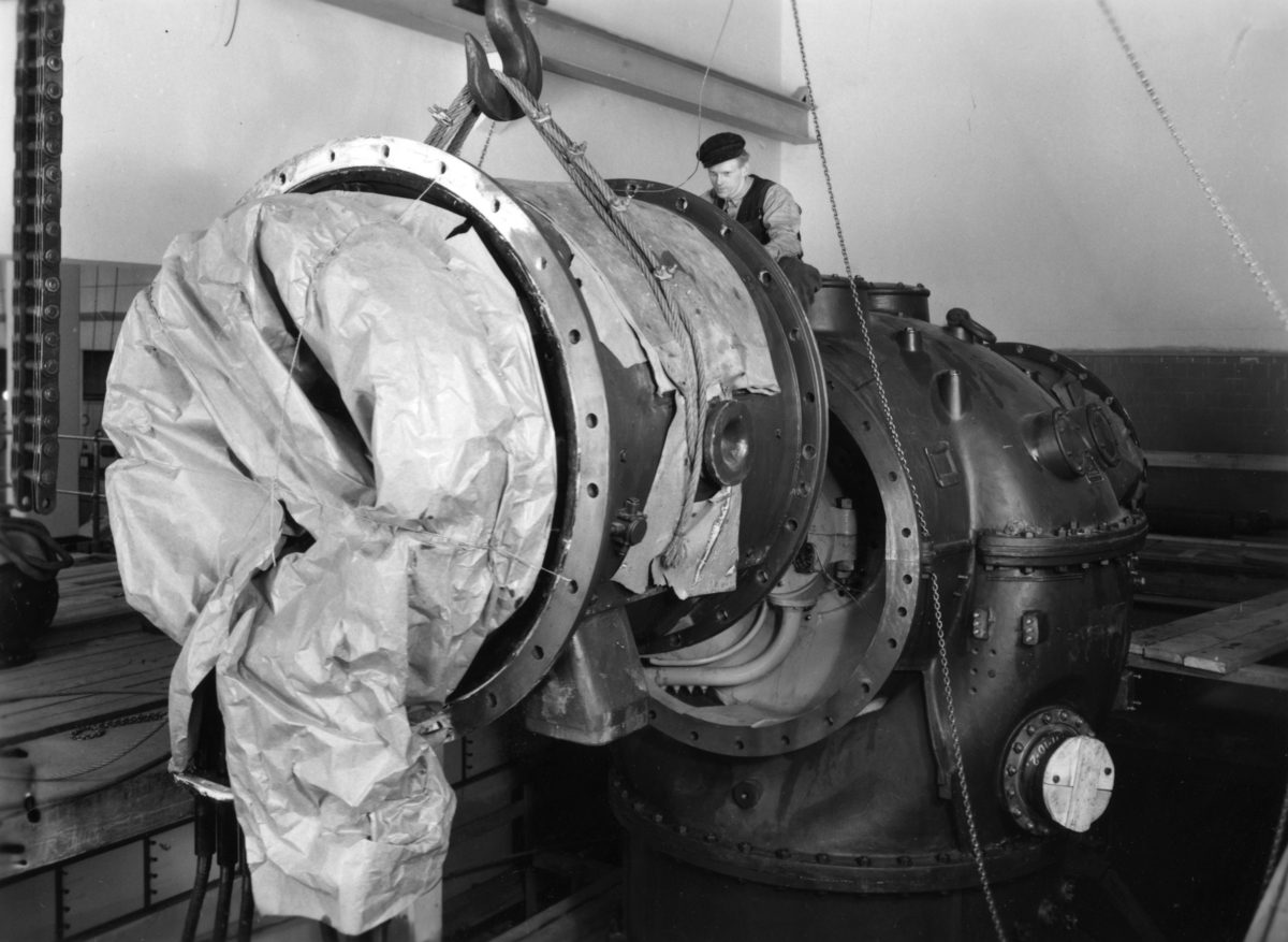 En man arbetar med montering av STAL-turbinen på Papyrus, 2/5-1951.