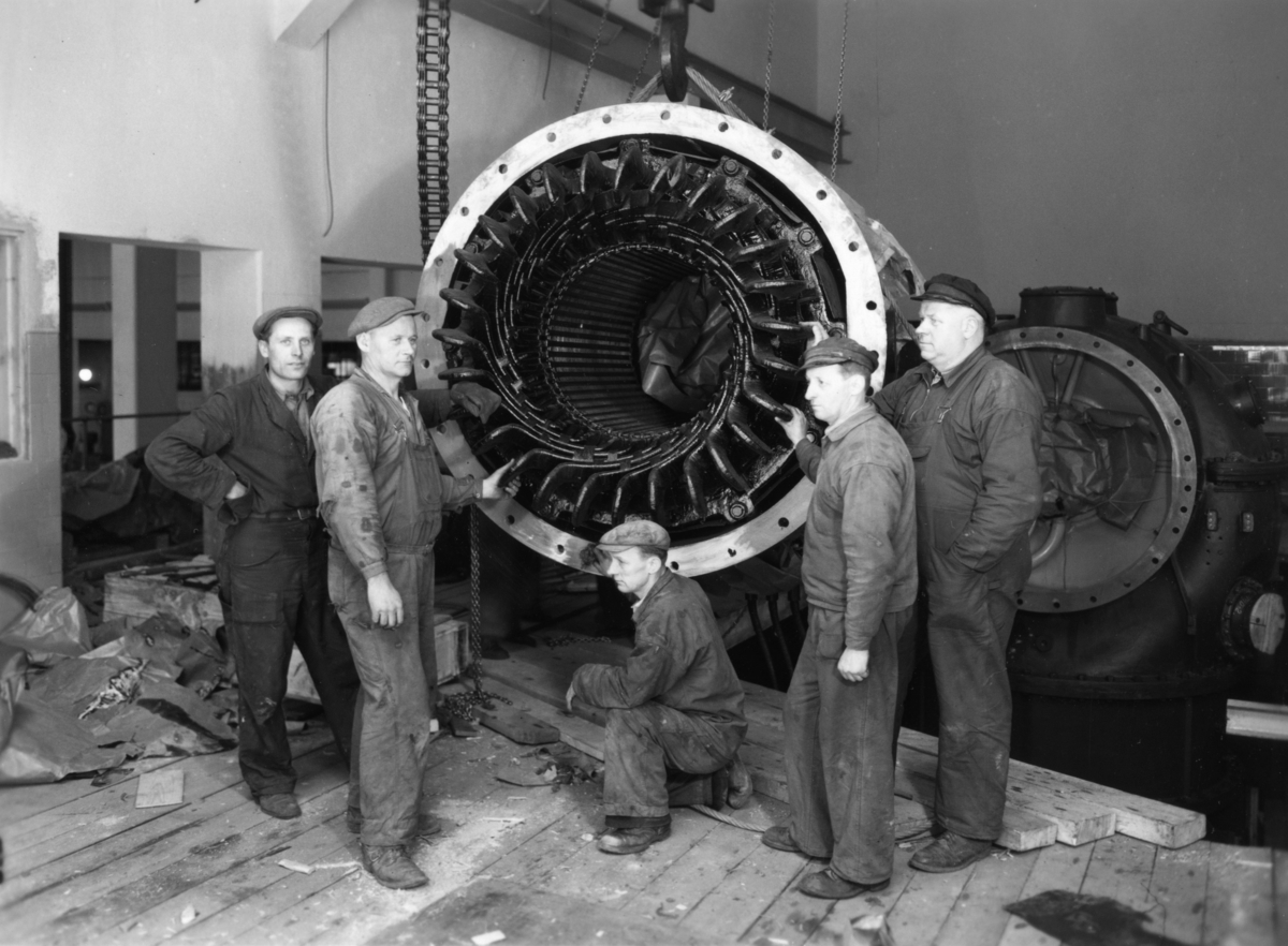 Fem män arbetar med montering av STAL-turbinen på Papyrus, 2/5-1951.