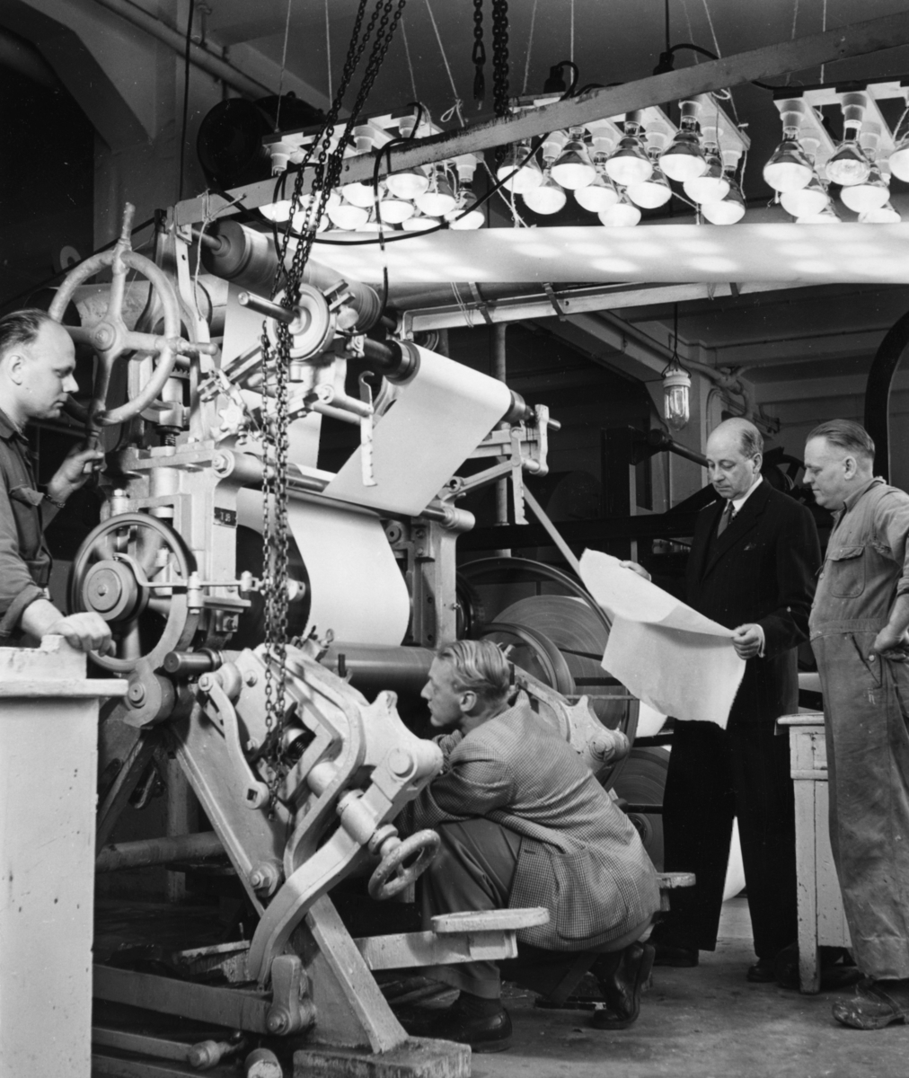 Fyra män arbetar vid djuptrycksmaskin T18 på Papyrus, okt. 1951. Arne Ahlström, Ingenjör Danielsson, Gunnar Lalin, Einar Floberg