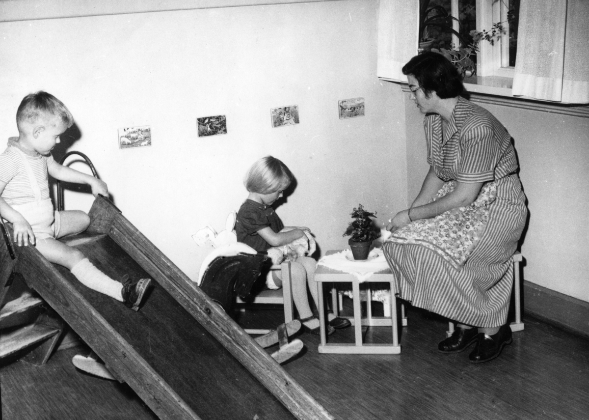 2st av barnen Jönsson på daghemmet? Barnkrubban, hösten 1954. En kvinna är också med på bilden. Gulli Österberg.