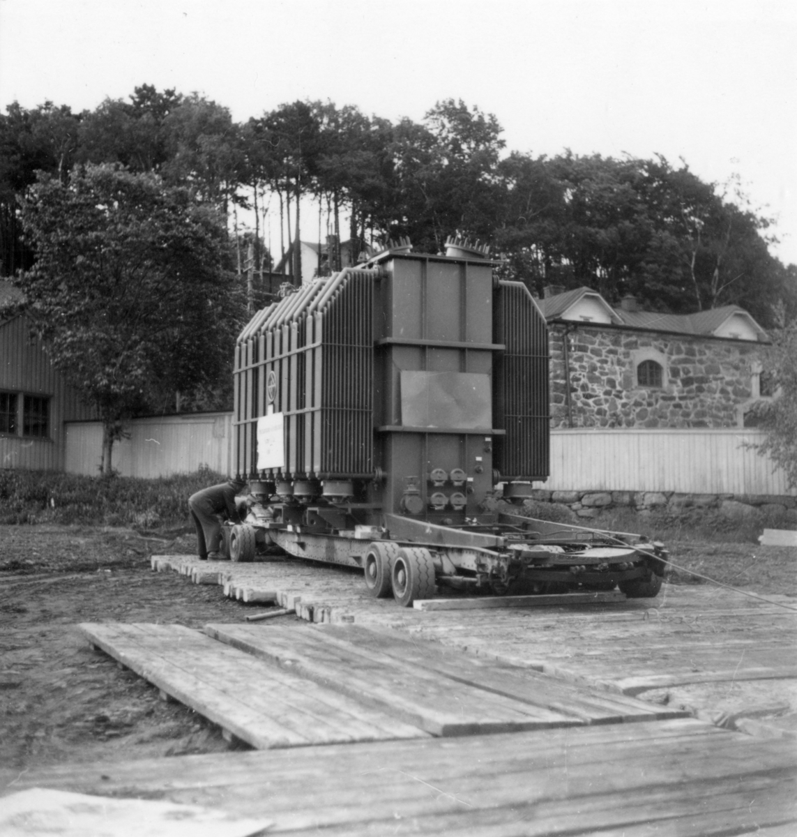 Transport av transformator 50 kW på Papyrus fabrik, 18/6-1955. Två okända män är med på bilden.