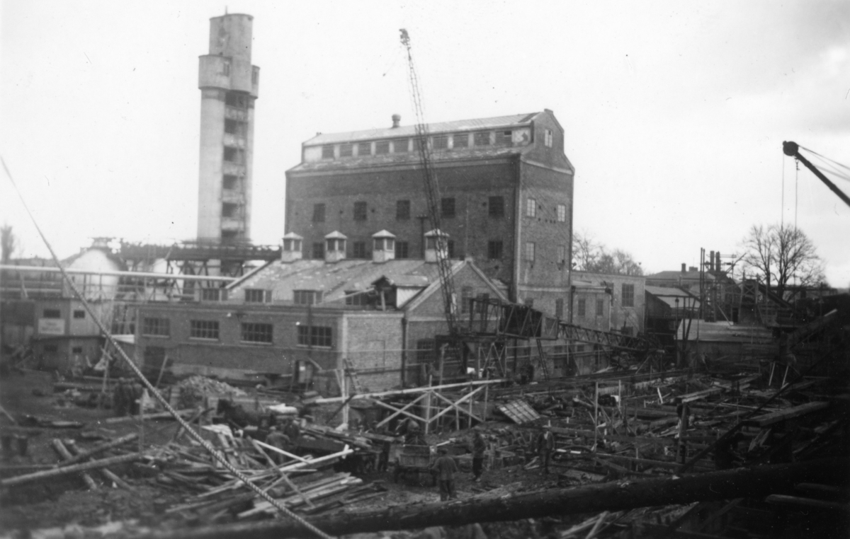 Rivning inför uppbyggnad av byggnad 110 o 111. På Papyrus fabriksområde, 10/12-1945. I bakgrunden syns sulfitfabriken och syratornet
