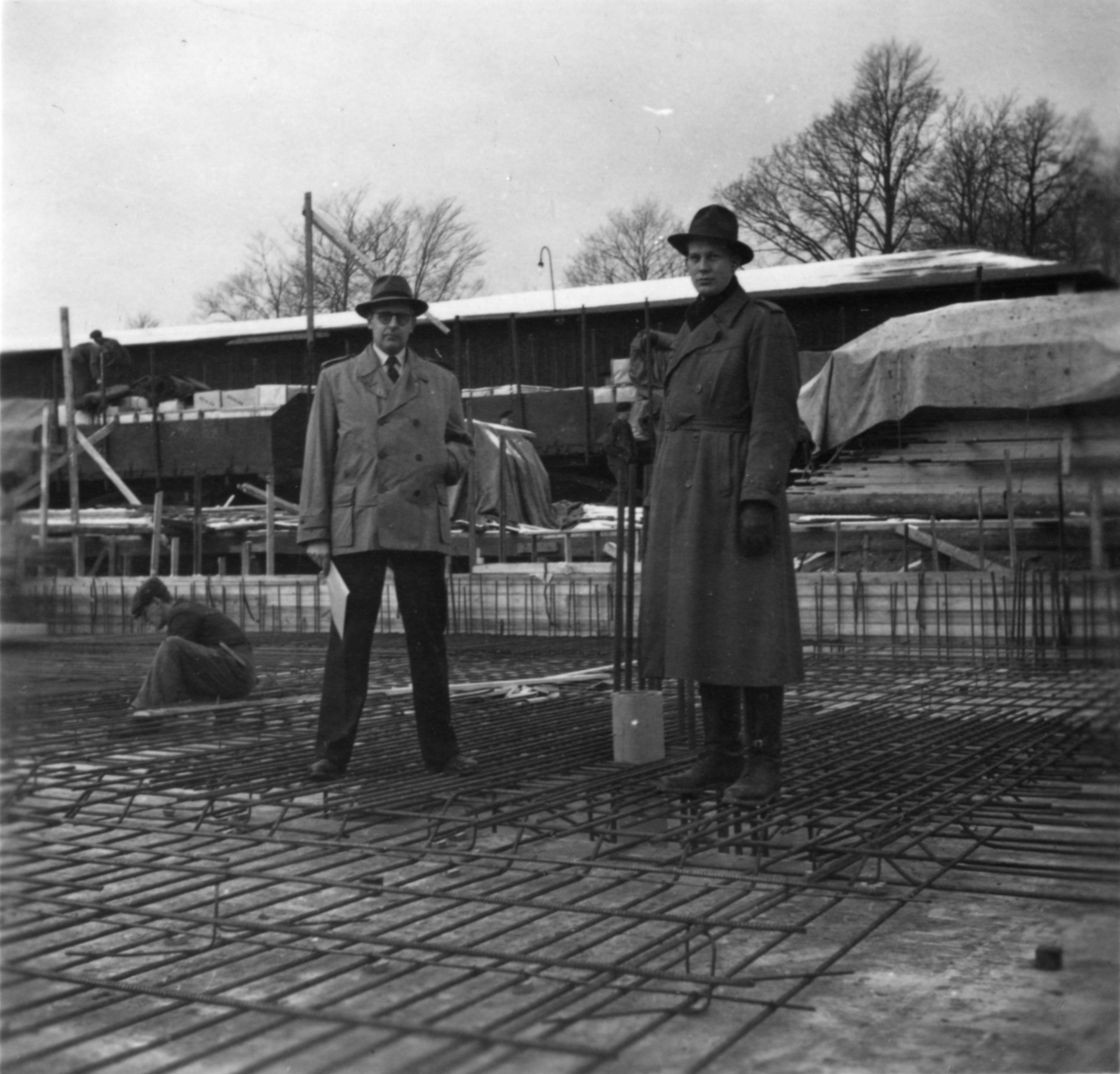 Lagerbyggnad 110 och 111 under byggnad. Två män med på bilden.