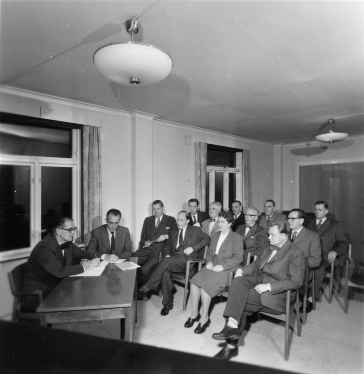 Ordförande ingenjör fr. vänster: Wiggo Odenius, sekreterare ingenjör Karl-Erik Tollgerth. Rad 1 från vänster: ingenjör Holger Sillén, okänd, Astrid Nilsson, personalchef Håkan Törnquist. Rad 2 från vänster: Valter Wallbenius, Tage Bernhardtz, Oskar Nilsson, ?. Rad 3 från vänster: Karl Nygren, Charles Martinsson, Gustav-Adolf Johansson.