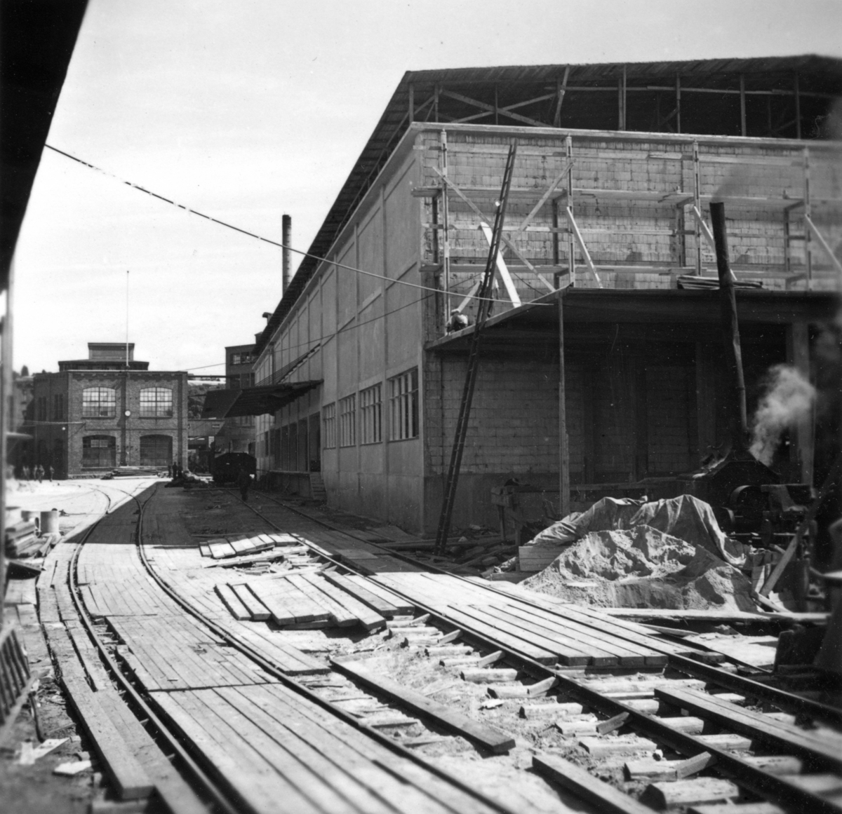 Lagerbyggnad 110 och 111 under uppbyggnad på Papyrus fabriksområde, 9/7-1946.