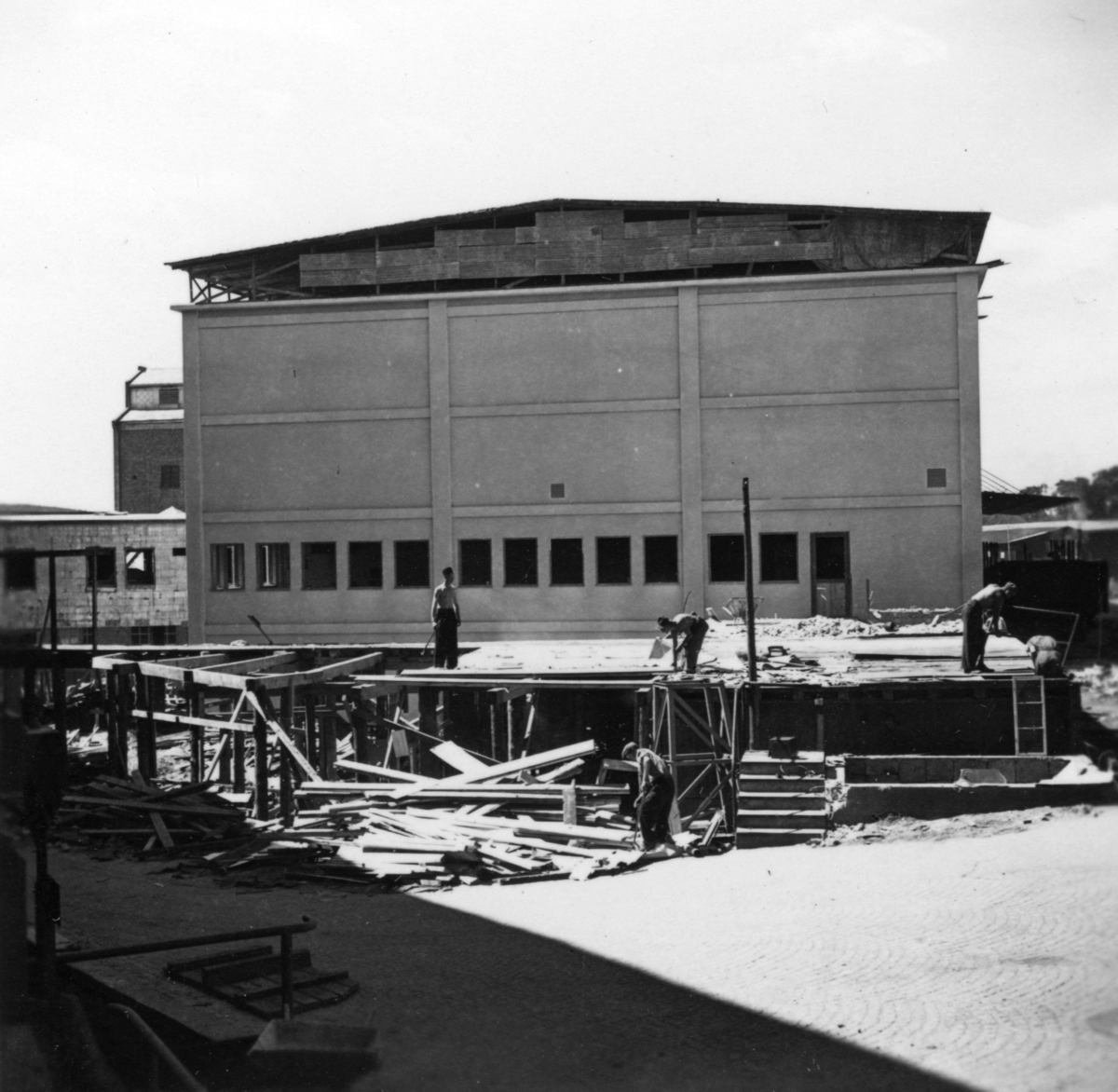 Lagerbyggnad 110 och 111 under uppbyggnad på Papyrus fabriksområde, 9/7-1946.