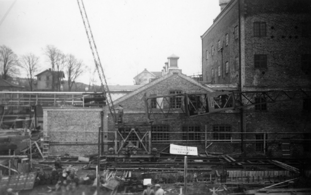 Lagerbyggnad 110 och 111 under uppbyggnad på Papyrus fabriksområde, 10/12-1945.
