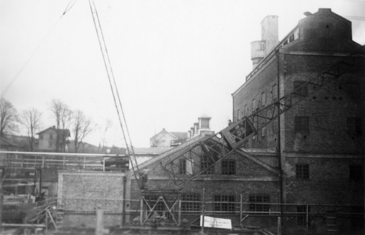 Lagerbyggnad 110 och 111 under uppbyggnad på Papyrus fabriksområde, 10/12-1945.