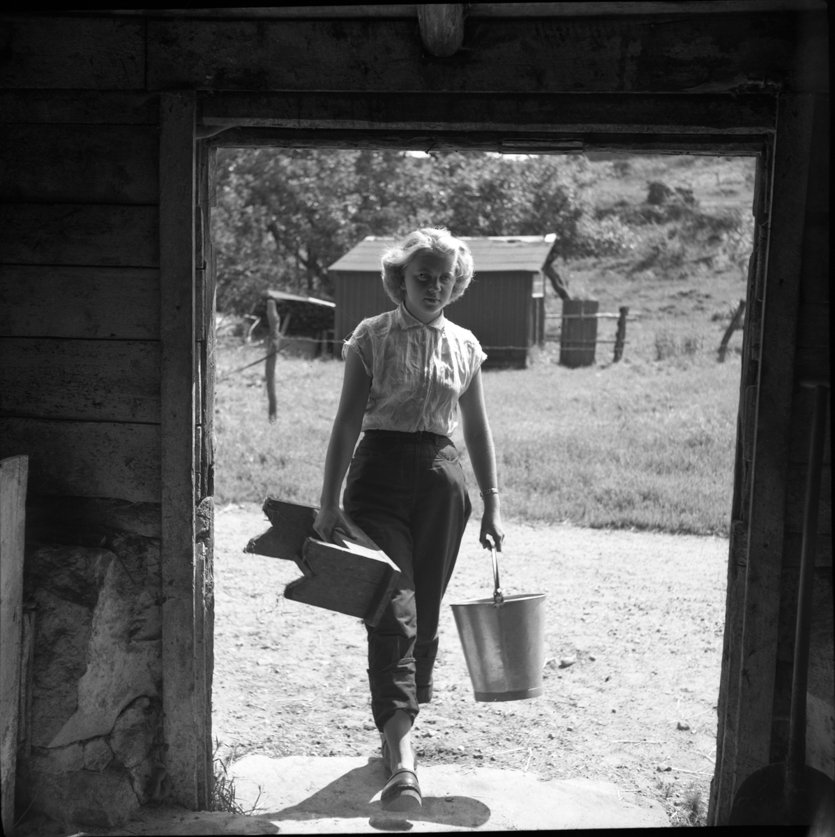 Ingela Öberg med mjölkspann och mjölkpall på väg in genom dörren till ladugården.