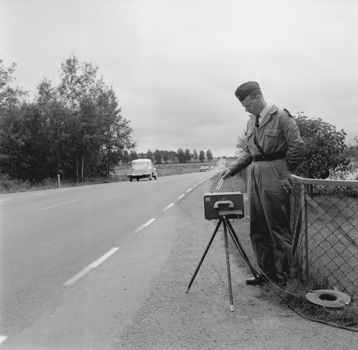 En polis står med sin mätutrusning utmed en väg.