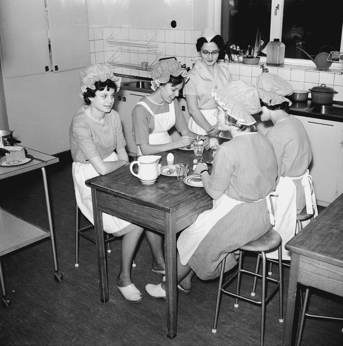 Eleverna på Yrkesskolan sitter vid bordet i skolköket.