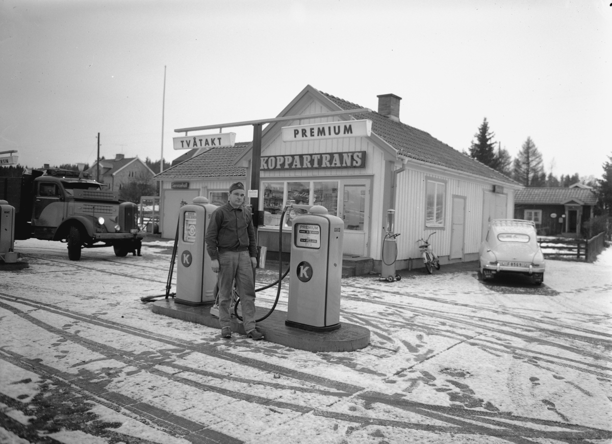 Vid bensinstationen Koppartrans står en man vid pumparna.