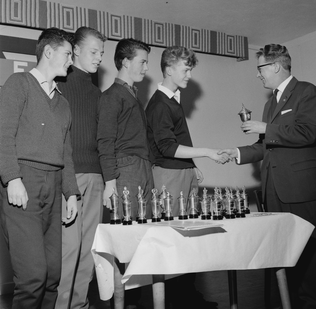 Prisutdelare Carl-Gustav Halldèn delar ut priser till ungdomar i HIF:s (Huskvarna idrottsförening).